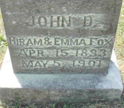 | 63 | Fox  | John D. | 04/15/1893 | 05/01/1901 | | | s/o Hiram & Emma |