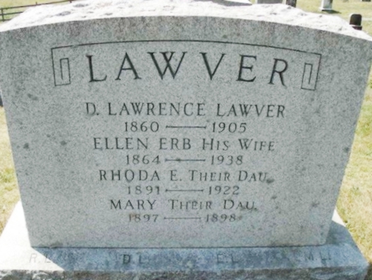| 182 | Lawver  | Rhoda E. | __/__/1891 | __/__/1922 | | | d/o DL & E |
