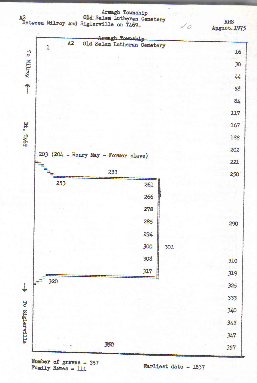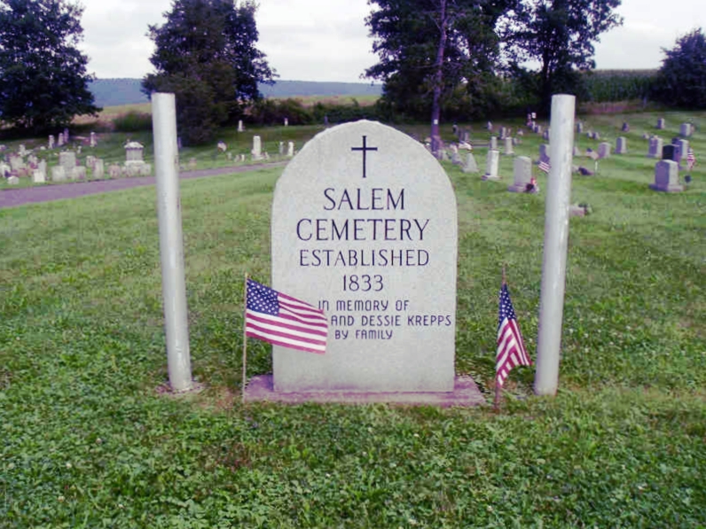 Directions from the Milroy exit on US-322, Reedsville, PA: Head east on Colonial Dr 0.3 mi; Turn left onto Old US Hwy 322 for 0.2 mi; Slight right onto Hill St for 0.1 mi; Continue straight to stay on Hill St for 0.2 mi; Turn right onto Sigler St for 0.4 mi; Continue onto S Main St for 0.3 mi; Continue straight onto Salem Rd for 1.9 mi; cemetery will be on the left.