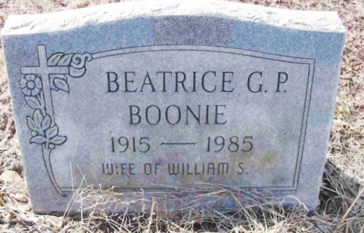 | 75 | Boonie  | Beatrice G. P. | __/__/1915 | __/__/1985 | | | w/o William S |