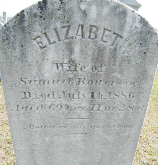 | 83 | Bowersox  | Elizabeth | __/__/__ | 07/04/1886 | | | w/o Samuel, 69y 11m 28d |