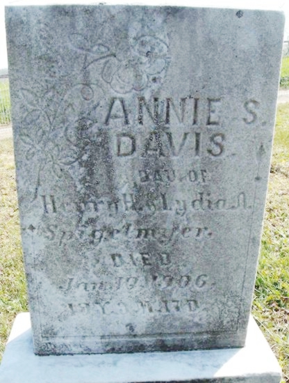 | 132 | Davis  | Annie S. Spigelmyer | __/__/__ | 01/10/1906 | | | d/o Henry & Lydia Spigelmyer, 19y 9m 17d |