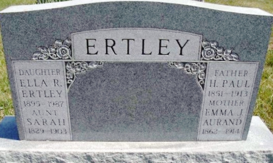 | 172 | Ertley  | Sarah | __/__/1829 | __/__/1903 | | | "Aunt Sarah", buried with H Paul & Emma |