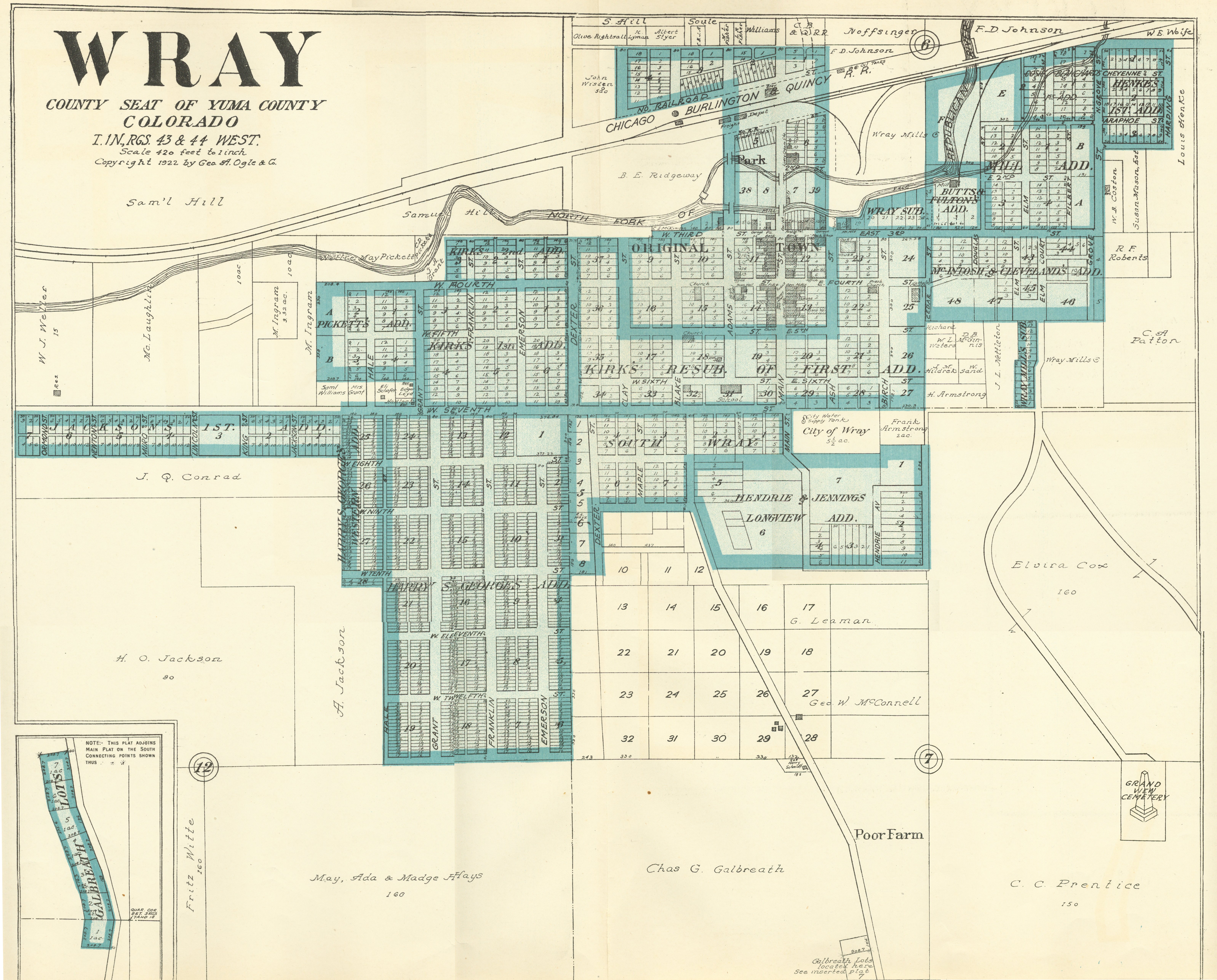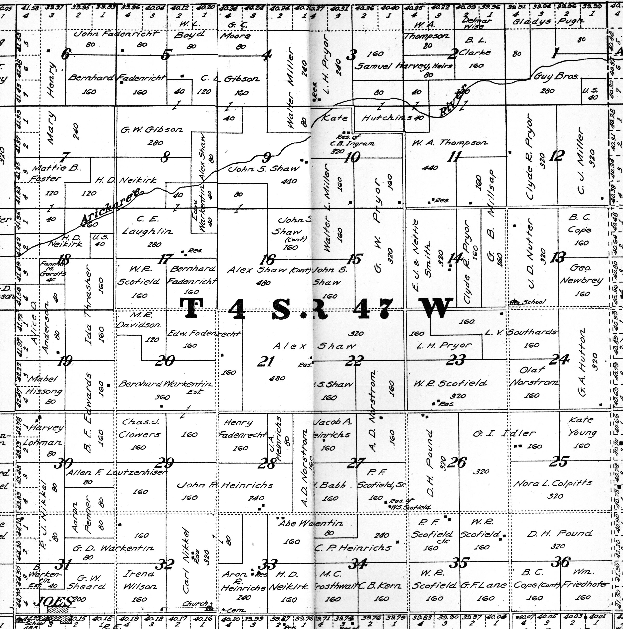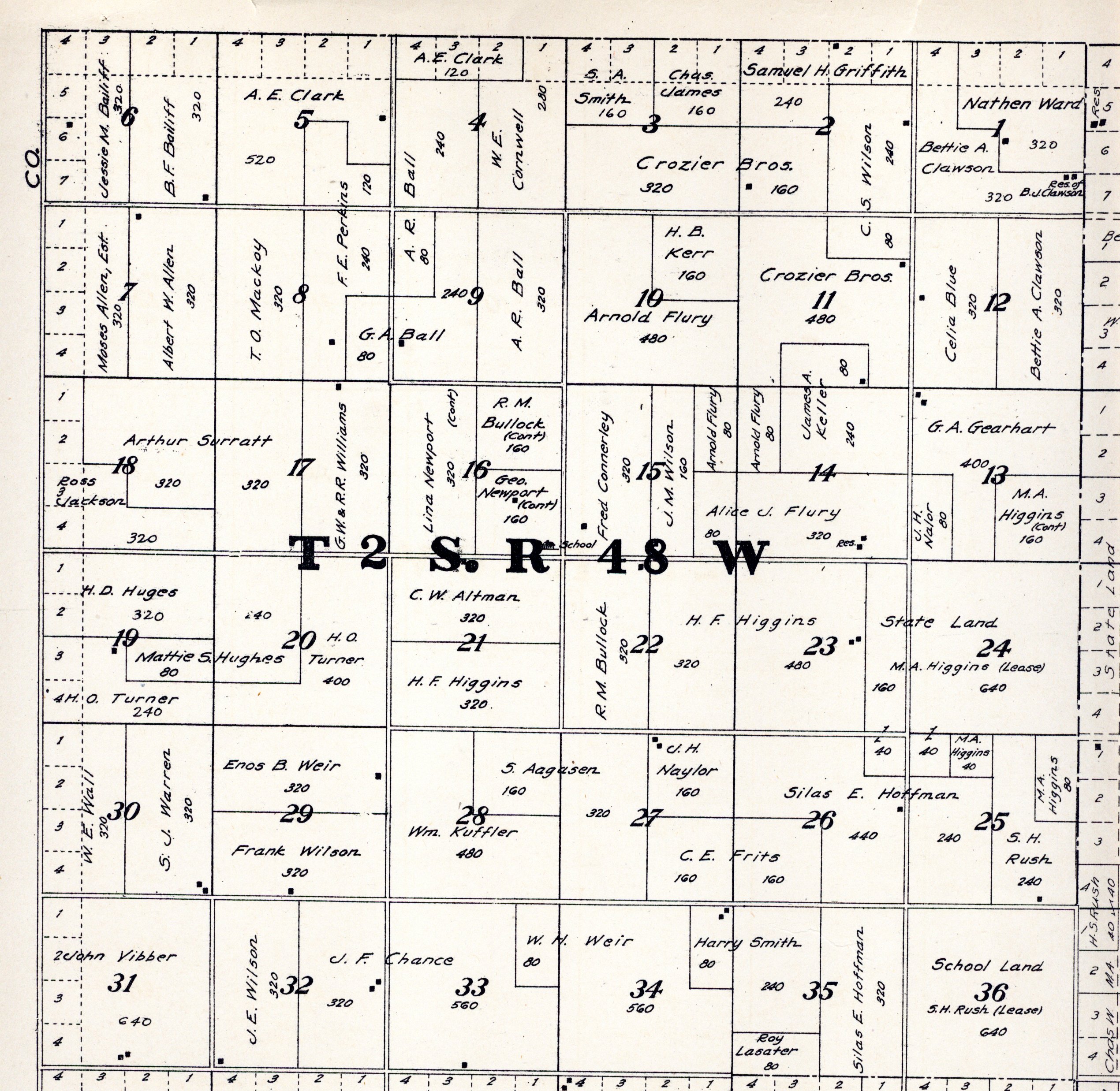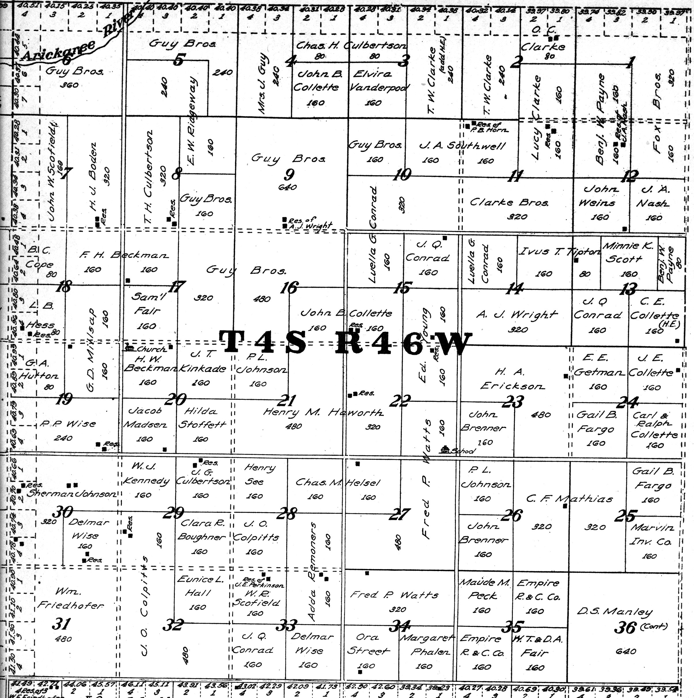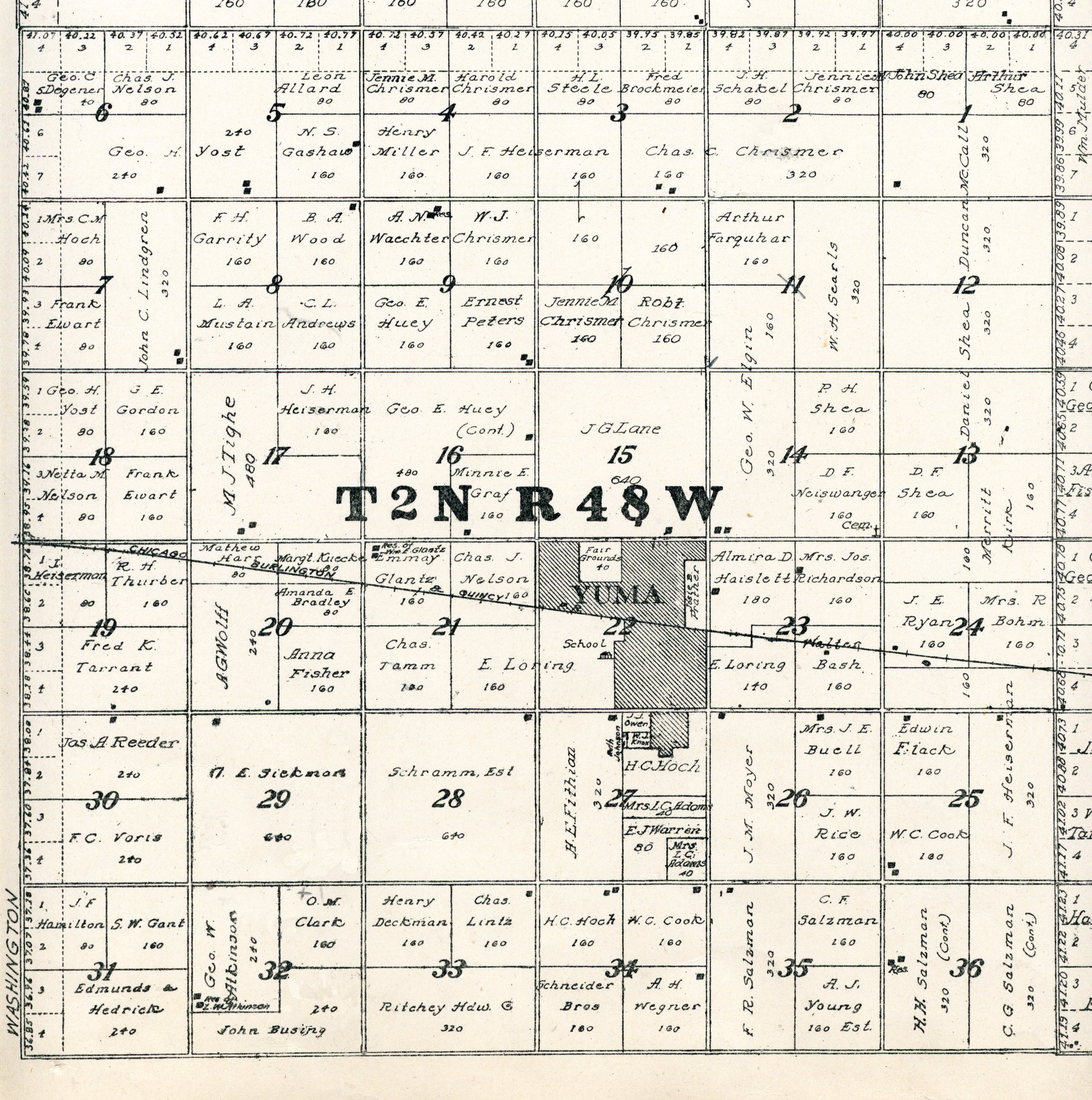 Yuma County Colorado 1922The attached files are 300 dpi scans of pages from the Standard Atlas of Yuma County Colorado published by George A. Ogle & Company, Chicago, 1922. The 20 x 18 inch title page was scanned in four sections and pieced back together. As is evident from Title.jpg there was a bit of light leak around the edges of the scan. The town and village plats were drawn together on four atlas pages and were scanned individually. The Eckley, Wray and Yuma maps were to large for my scanner and were scanned in sections and pieced back together. The 70 township ownership map plates were originally drawn six or seven townships to an atlas double-page. The individual townships were almost letter size and were scanned individually and not pieced back to full page size. I scanned the ownership maps over a period of two years from two different atlases with two different scanners. You will notice that while the majority are color scans, some are grayscale and a few are black and white. The Standard Atlas land ownership information dates from mid to late 1920 NOT 1922. I am in the process of putting together an index of names mentioned on each of the township maps. The atlas did not have a legend page. I have one I put together on the Yuma County, Colorado, COGenWeb pages. The 1922 Colorado map from the Standard Atlas was scanned two years ago and the individual county maps uploaded to the Digital Map library. This copy of the 1922 Standard Atlas was owned by my great grandfather, W.B. Coston. He added comments that I removed to several of the maps. You will note some stray lines on the maps that I did not remove. Other sections of the Atlas were a Patrons and Business Reference Directory, Business Advertisements and donated "Illustrations." All have been scanned or transcribed and uploaded to the Yuma County COGenWeb pages.