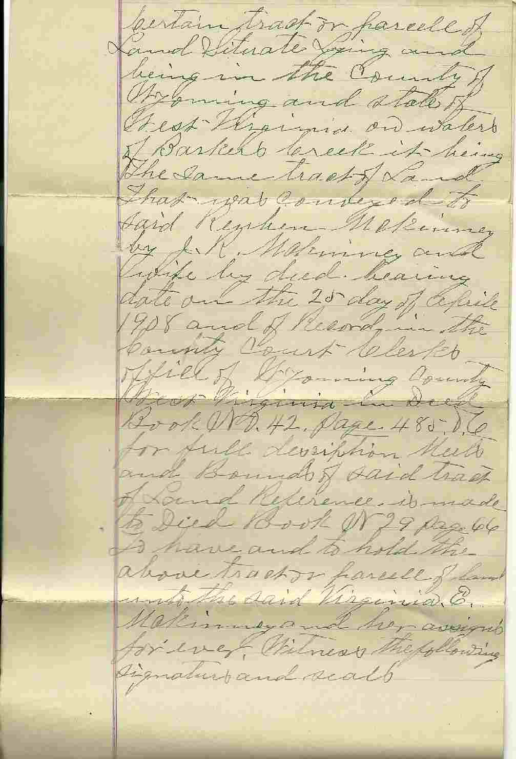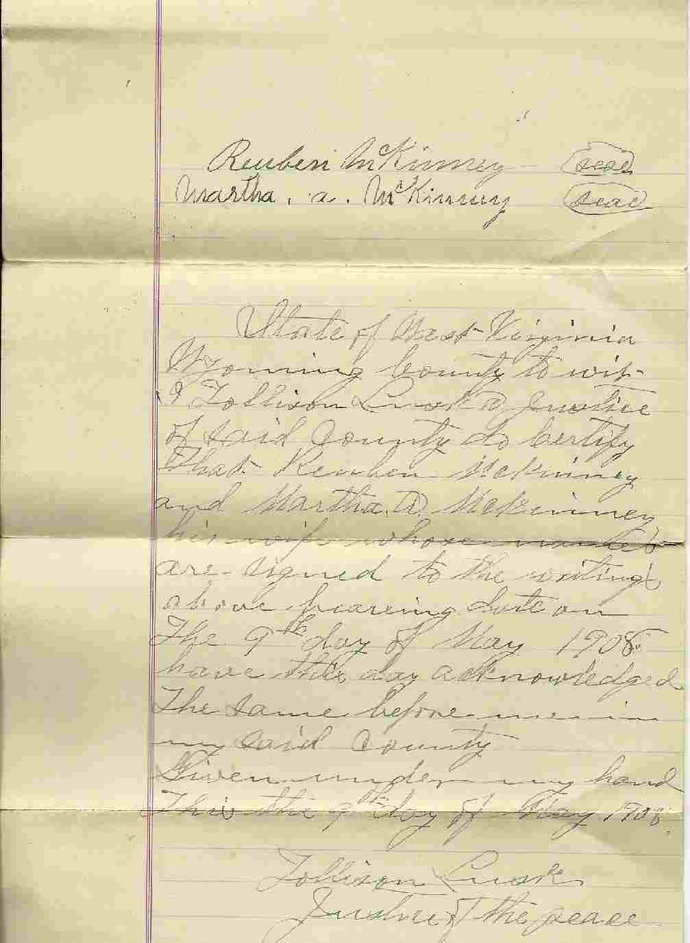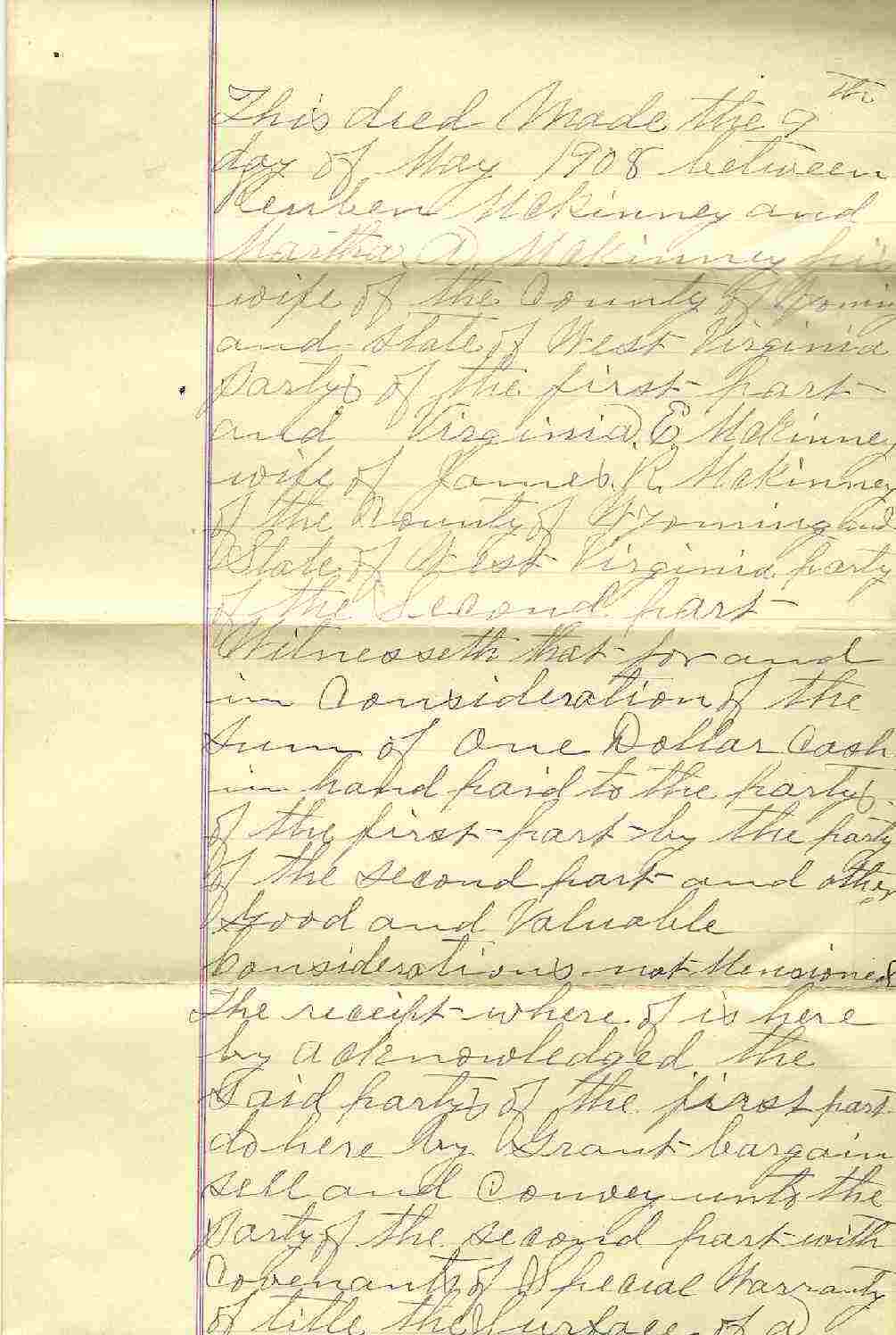 | Apr 9, 1908 deed, Reuben and Martha A. McKinney conveyed a tract of land on Barker's Creek, to Virginia E. McKinney, wife of James R. McKinney. Page 1, Page 2, Page 3, Page 4. | 74K | Mar 2010 | Janice E. McCoury |