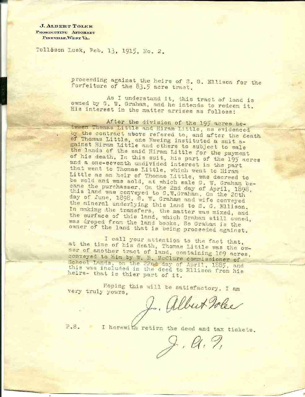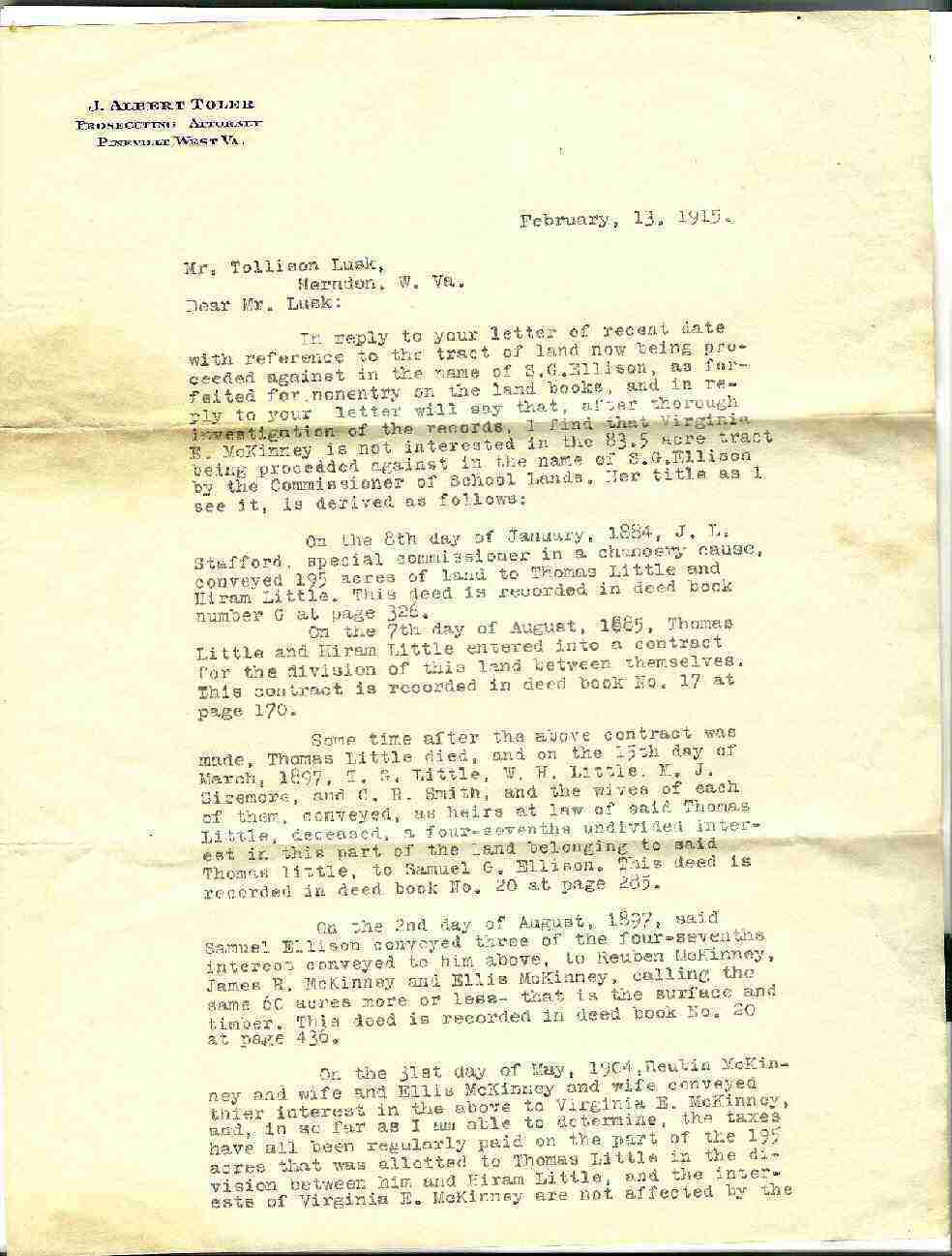 | Letter dated Feb 13, 1915, from Prosecuting Attorney, J. Alfred Toler, Pineville, WV, to Mr. Tollison Lusk, Herndon, WV. Page 1 of letter, Page 2 of letter | 87k | Mar 2010 | Janice E. McCoury |